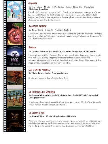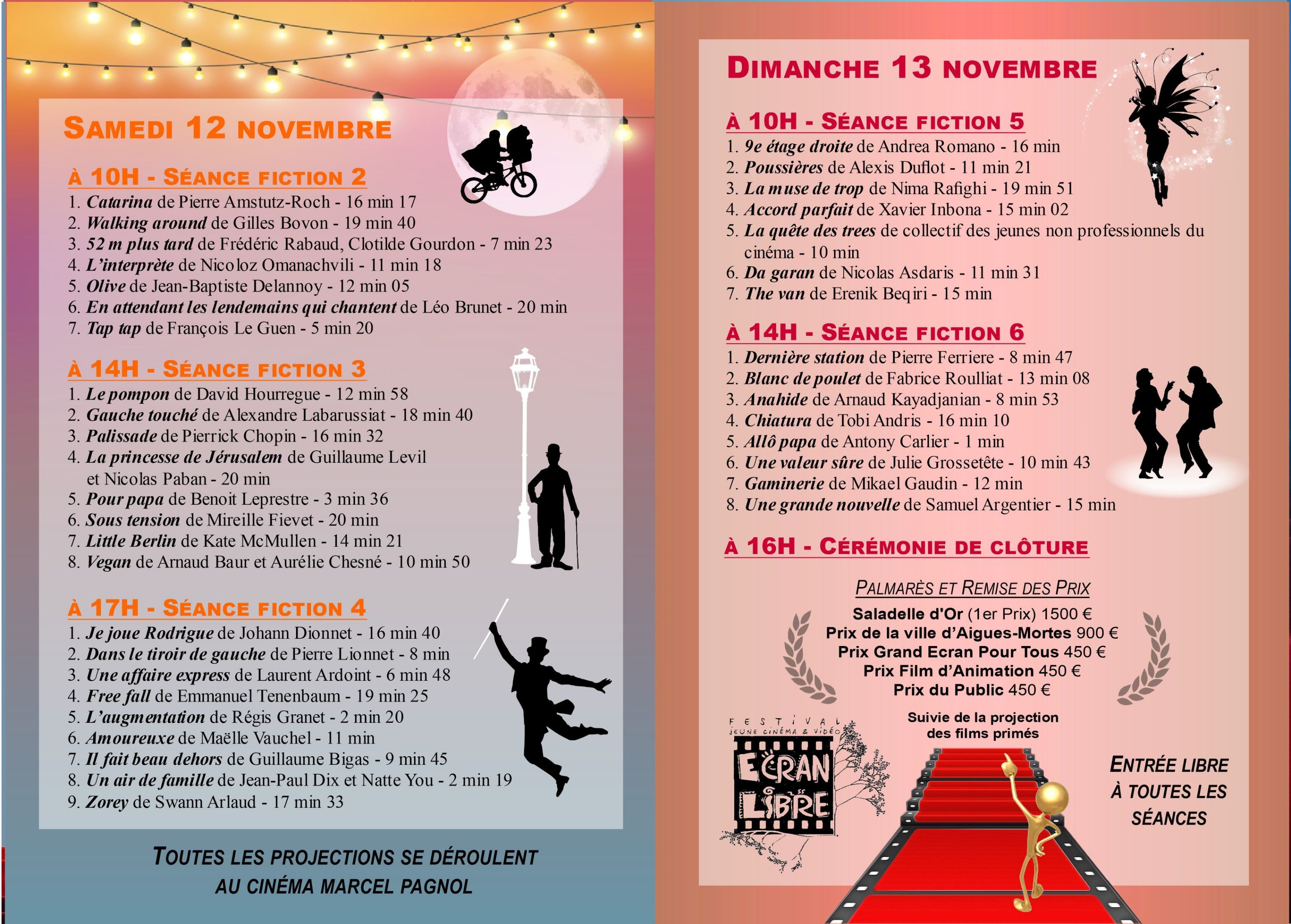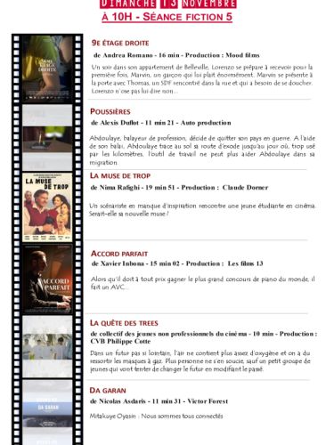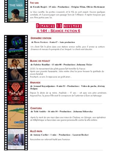 Vendredi 11 novembre, 14 h animation ; à 17 h, fiction ; à 19 h, lancement et vernissage de l’exposition Différences ; à 21 h, carte blanche quatre courts-métrages. Samedi 12 novembre, à 10 h, fiction ; à 14 h fiction ; à 17 h, diction. Dimanche 13 novembre, 10 h, fiction ; à 14 h, fiction ; 16 h, palmarès et clôture.
