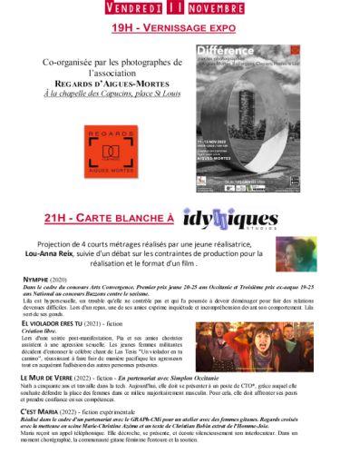 Carte blanche sera donnée à Idylliques studios avec la projection de quatre courts-métrages de Lou-Anna Reix, en sa présence. Le lancement officiel aura lieu le 11 novembre, à 19 h, à la chapelle des Capucins en partenariat avec Regards d’Aigues-Mortes pour son exposition Différences.