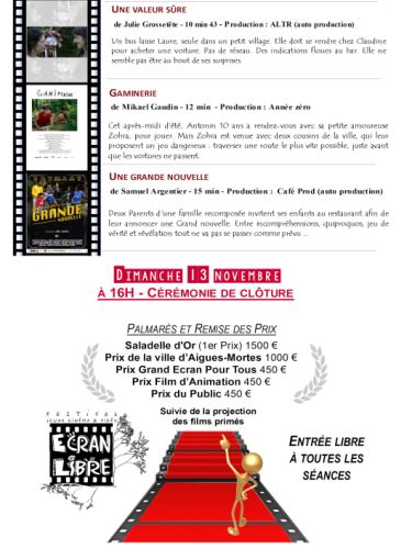 Parmi les 56 films en lice au Festival international du court-métrage, Ecran libre, qui s’est déroulé les 11, 12 et 13 novembre, c’est le film Free Fall d’Emmanuel Tenenbaum, qui se déroule pendant l’effondrement du World Trade Center, qui obtient le 1er pprix, prix de la Saladelle d’or, attribué par le jury des professionnels du cinéma. Le syndrome d’Archibald de Daniel Perez, obtient le prix de la ville d’Aigues-Mortes ; Un cœur d’or, le prix du film d’animation, avec un accessit à La belle survie de Louis Besse ; le prix Grand Ecran pour tous, attribué à un premier film, va à Une grande nouvelle de Samuel Argentier. Le prix du public a été décerné à Poussières d’Alexis Duflot, touchant fortement l’assistance.