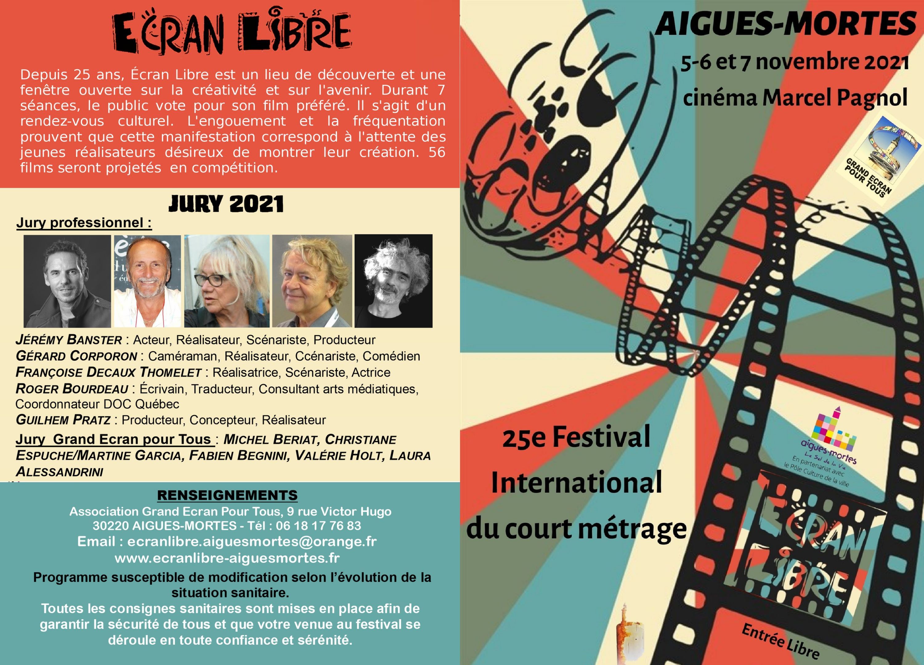 Le festival a lieu les 5, 6 et 7 novembre : à partir de 10 h, au cinéma Marcel-Pagnol, projections des films, table ronde et rencontres avec les réalisateurs. Dimanche 7, cérémonie de clôture, palmarès et remises des prix. Les membres du jury professionnel sont : Jérémy Banster, Gérard Corporon, Françoise Decaux Thomelet, Roger Bourdeau et Corinne Maillé. Au jury Grand Écran pour Tous : Michel Bériat, Martine Garcia ; Valérie Holt, Florent Begnini ; Laura Alessandrini.