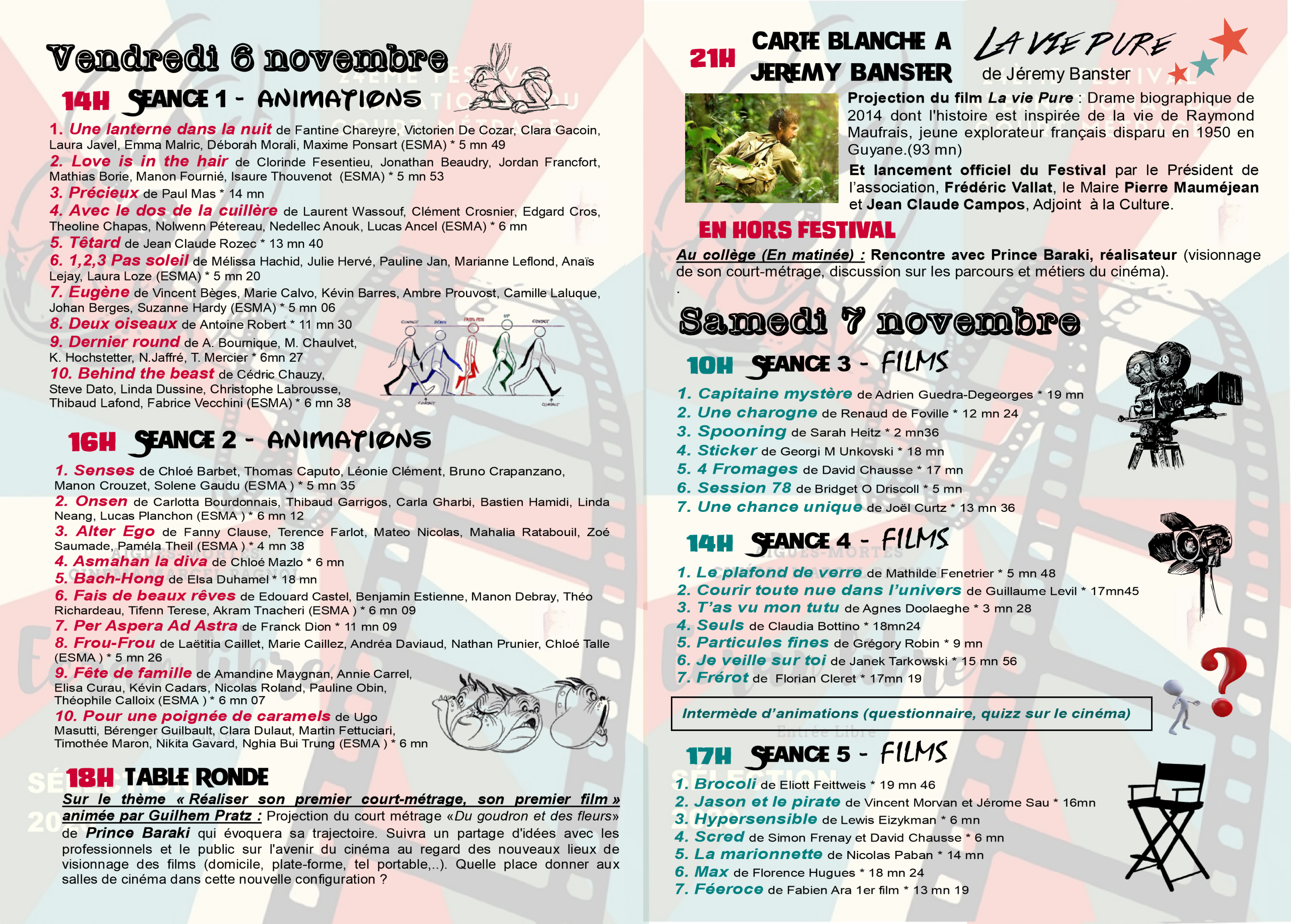 Le film de Jérémy Banster, La Vie pure, a donné le coup d’envoi officiel de la manifestation et durant trois jours les spectateurs ont découvert une soixantaine de films de jeunes auteurs pour la plupart, dans des registres les plus divers, sérieux, humoristiques, tendres ou illustrant des phénomènes de société. Un tourbillon de propositions auxquelles était confronté un public conquis qui, à chacune des sept séances, votait pour le film de son choix.