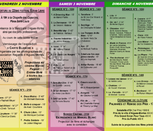 Le lancement officiel du festival aura lieu de concert, avec le vernissage de l’expo-photos Carte blanche de l’association Regards d’Aigues-Mortes chapelle des Capucins, vendredi 2 novembre, à 18 h. Deux manifestations qui honorent la vie culturelle aigues-mortaise.