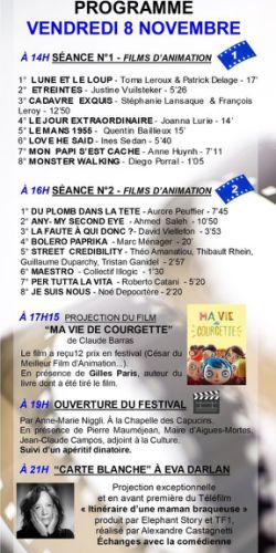 Vendredi 8 novembre : à 14 h, séance 1 (huit films) ; à 16 h, séance 2 (huit films) ; à 17 h 15, projection de Ma vie de courgette en présence de l’auteur du livre, Gilles Paris ; à 19 h, ouverture du festival à la chapelle des Capucins ; à 21 h, carte blanche à Eva Darlan, projection en avant-première du téléfilm Itinéraire d’une maman braqueuse d’Alexandre Castagnetti suivi d’un échange avec la comédienne.